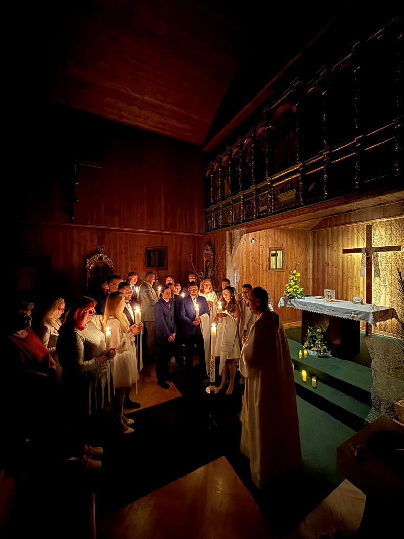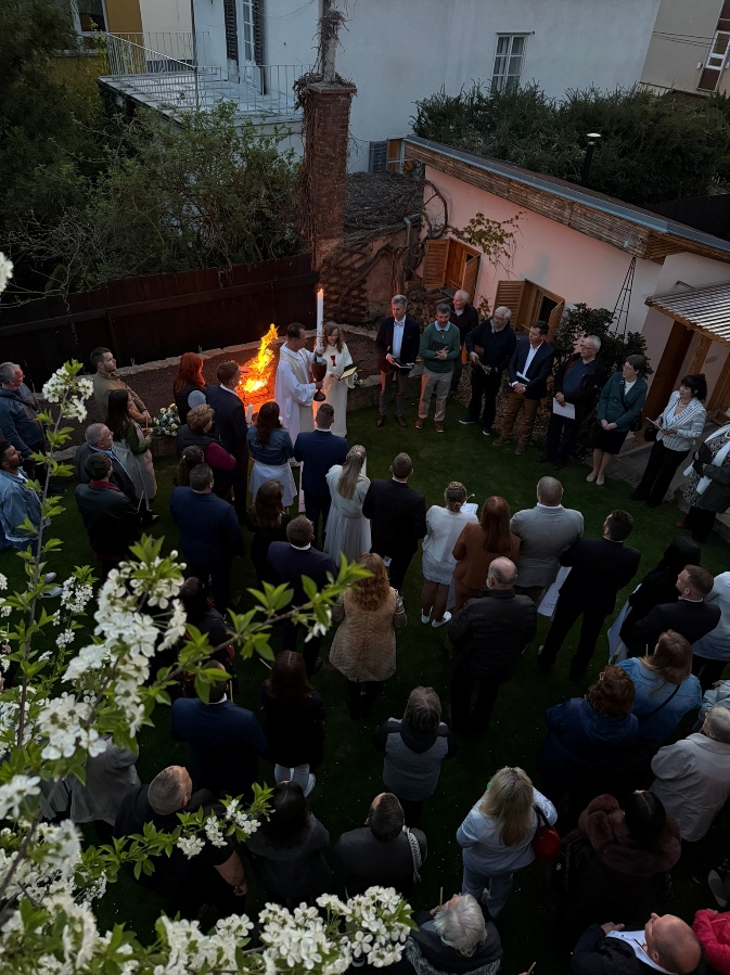 Po západu slunce ve 20:00 hodin začaly letošní obřady noci zmrtvýchvstání Páně. Na farní zahradě Mirek troubením na šofar otevřel noc nocí. Zpíval sbor, kostelník Honza zažehl velikonoční oheň, bratr farář Martin připálil nový Paškál. Vnesli jsme průvodem světlo Kristovo do kostela. Katechumeni četli jednotlivá čtení určená pro vigilii.