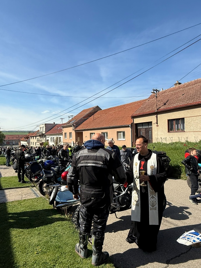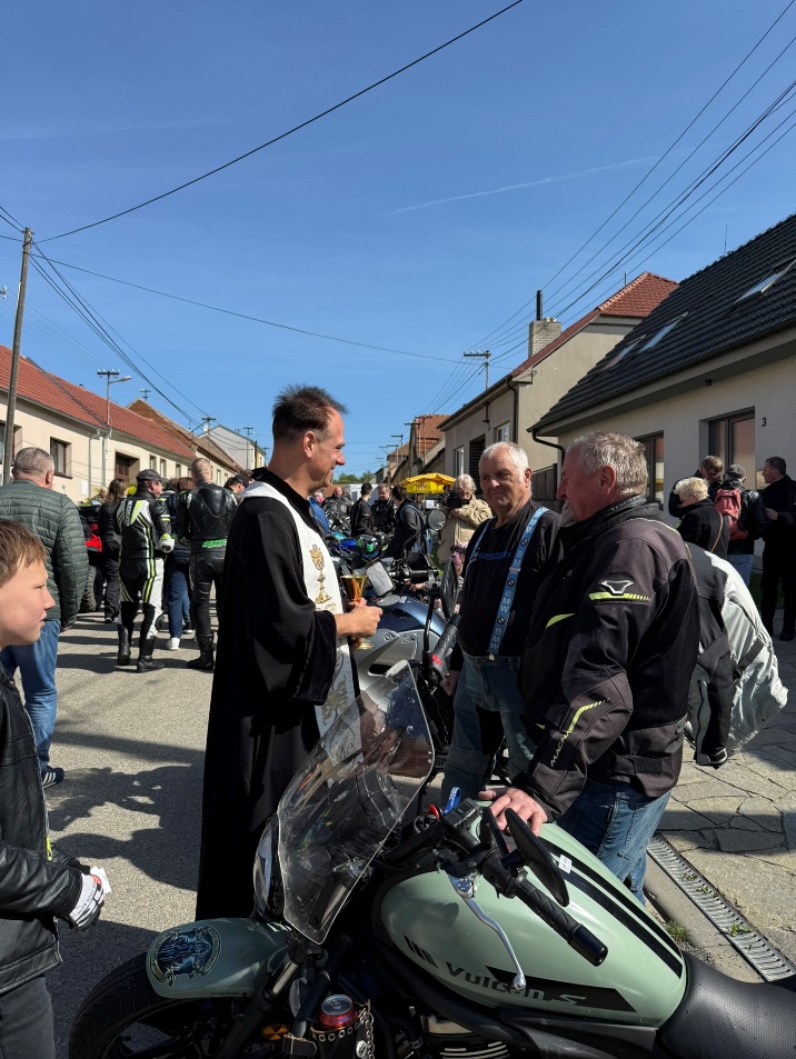 Náš bratr farář Martin se tohoto setkání každý rok účastní. Nejprve proběhlo přivítání všech účastníků od pana starosty PhDr. Jiřího Horáka, Ph.D. a organizátorů. Bratr farář setkání zahájí modlitbou a následně požehná osobně všem řidičům a rozmanité dopravní prostředky. Od motorek, čtyřkolek, kol až po koloběžky a odrážedla. Milou účastnicí byla holčička, která si na svoji koloběžku, jako spolujezdce vybrala šneka.