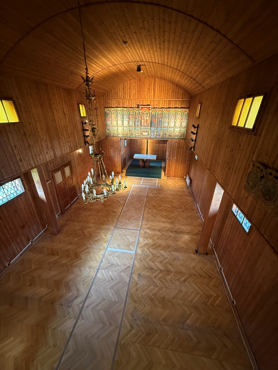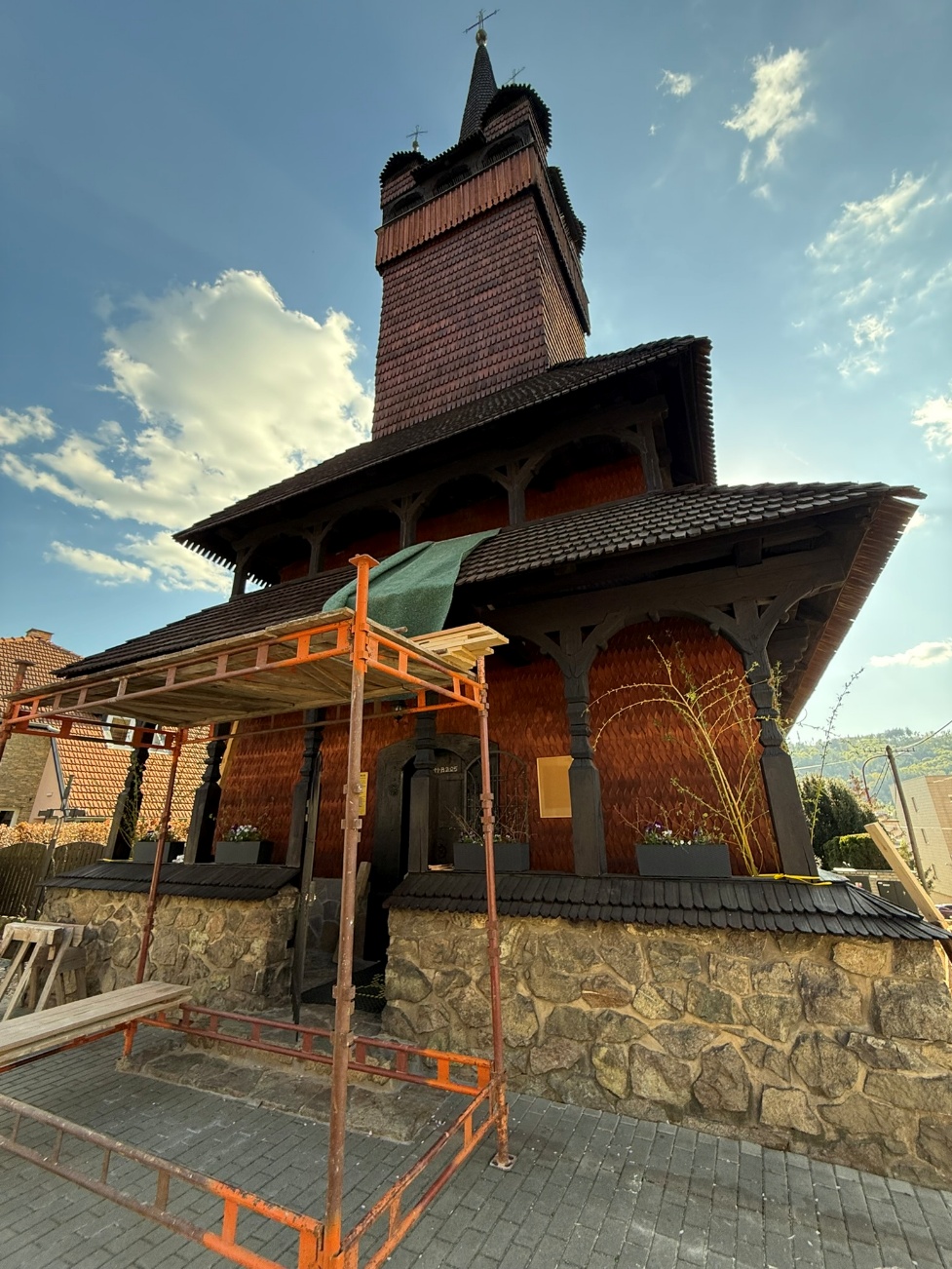 V pondělí 28. dubna 2025 jsme zahájili práce ve věži našeho Dřevěného kostela v Blansku. Pracovníci tesařství Opatřil - Vladík navezli dřevo a začali řezat, brousit a sbíjet trámy.