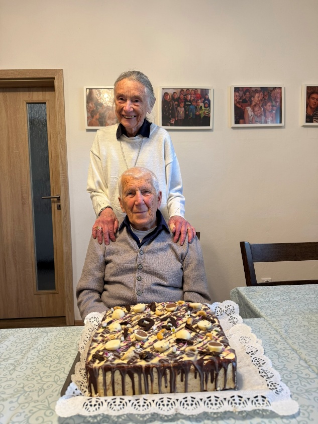 Oba v úžasné kondici. Máme je oba moc rádi a jsme vděční, že jsou součástí naší duchovní rodiny. Sestra Peťa Heinrichová za naše společenství připravila velký, originální diamantový dort. Diamantovou svatbu stvrdili Alenka s Vilémem obnovou manželského slibu a celý kostel jim zazpíval ve stoje blahopřání: “Aby vás Pán Bůh miloval...”.