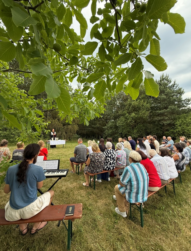 Po bohoslužbách byla pěkná zahradní slavnost. Muži obsluhovali ženy. Díky za celý tým bratrů pod vedením Pepy a Robiho. Harmonikáři Liduška a Pepa nás doprovázeli ve zpěvu písniček a mnozí se rádi přidali.
