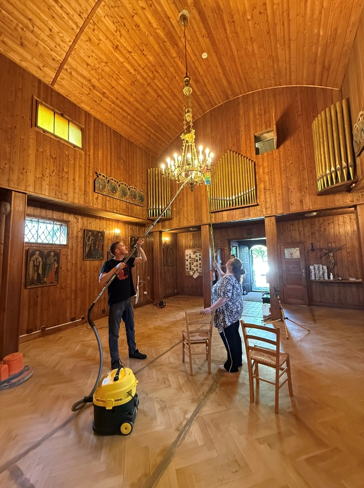 V pondělí 7. 7. 2025 nastoupili řemeslníci a rozeběhly se všechny práce. Demontáž dřevěného obložení, montáž rozvodů pro klimatizaci, s tím související elektrikářské práce, probíhalo kompletní broušení podlahy, její tmelení a lakování. Všechny práce probíhaly v podstatě 14 hodin denně – od rána do pozdních hodin. Ve čtvrtek 10. 7. jsme prožili společně 5 hodin usilovné práce v 18 lidech.